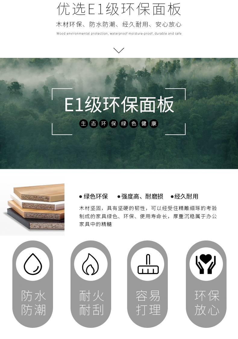基 材:E1級達(dá)歐洲環(huán)保標(biāo)準(zhǔn)基材(目前國內(nèi)辦公家具行業(yè)板式基材標(biāo)準(zhǔn)較高的),此基材用原木壓縮顆粒成型,甲醛含量小于1.2MG/L,具耐磨、抗刻劃、耐高溫、易清潔、耐酸堿等優(yōu)點(diǎn),經(jīng)防蟲、防腐處理,表面握釘力及靜曲強(qiáng)度均達(dá)到國家標(biāo)準(zhǔn);抗彎性能強(qiáng),不易變形。